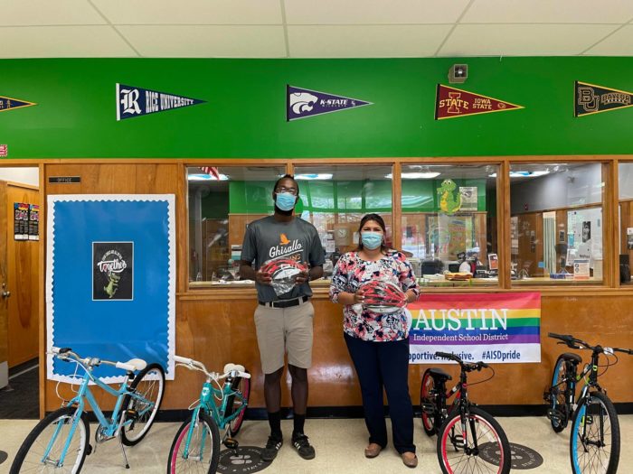In partnership with AISD Sustainability and AISD Transportation, we launched Bike & School Day on May 5th so students could learn and practice bicycle safety skills whether learning on campus or at home. 25 schools participated and we distributed 100 bikes (thanks to Guardian Bikes), 100 helmets (thanks to Texas Medical Association and Travis County Medical Alliance), and over 600 rechargeable bike light sets (thanks to Texas Department of Transportation) across the district for students who participated.